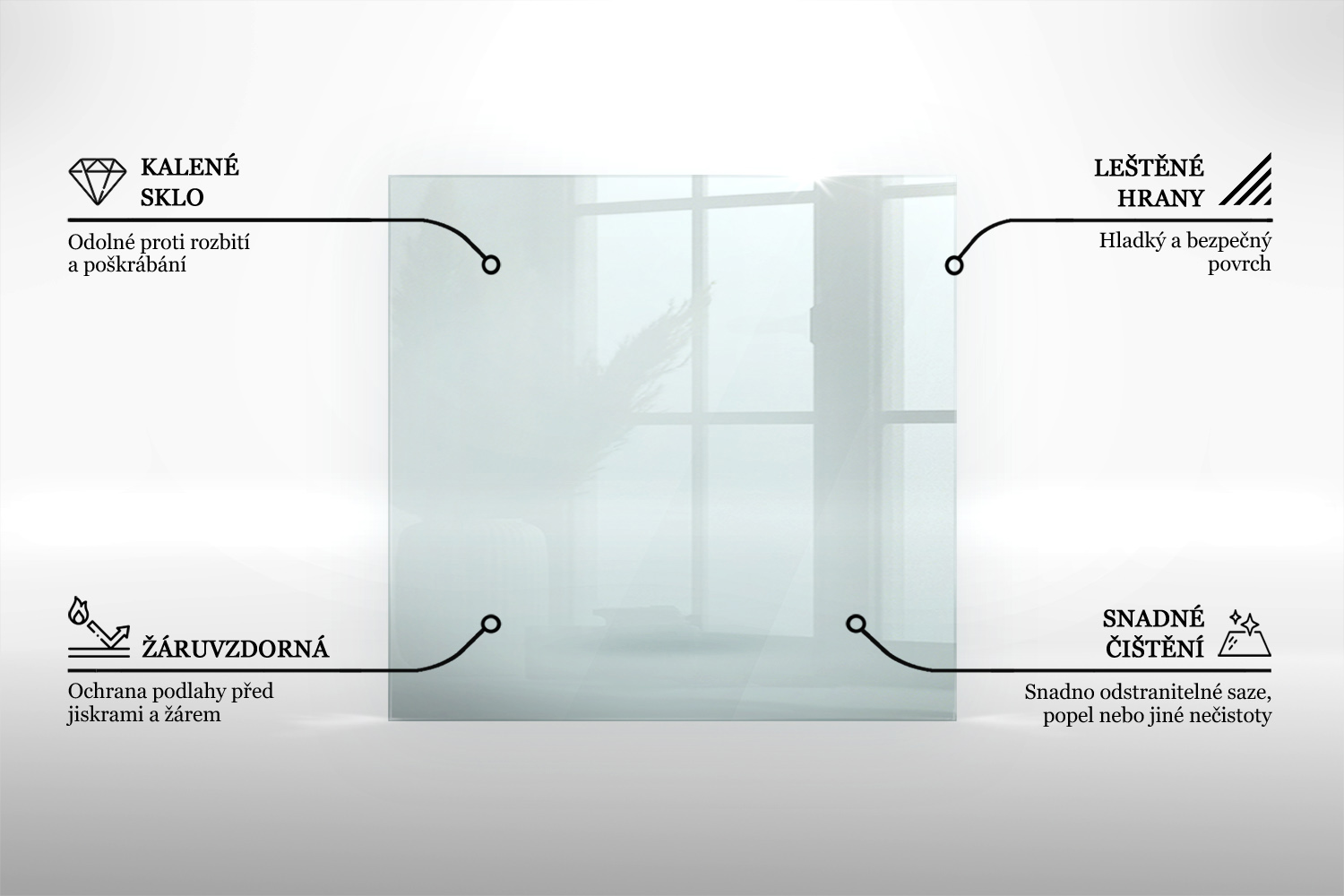 Vyrobeno je z prvotřídního tvrzeného skla, které garantuje vysokou pevnost a odolnost proti teplotním výkyvům. S úhlopříčkou 40 cm se tato podložka pod krbová kamna hodí zejména pod menší volně stojící kamna nebo oblíbené „kozy“. Průzračné provedení nechává vyniknout struktuře dřeva, laminátu či dlažby pod ním, takže podložka v prostoru opticky téměř zmizí, přičemž svou ochrannou funkci plní na jedničku.